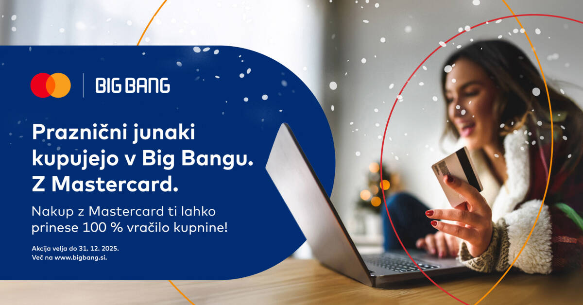 Vsak, ki do 31. 12. 2025 opravi nakup s kartico Mastercard v trgovinah Big Bang ali na bigbang.si, lahko sodeluje v žrebanju za vračilo celotne kupnine.